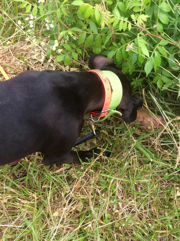 My frustration quickly dissipated when I gave Layla the "Leave it" command, followed by the "Find it" command. She immediately ignored the stinky carnage, and ran right back to the original line. She made quick and easy work of the remainder of the line, getting of only briefly where a path was mowed through the tall grass. Again, these transitions in cover often allow scent to drift downwind. She trailed briefly down the trail prior to correcting herself, and completing the trail where the boar's foot was located. Here she is at the finish line.